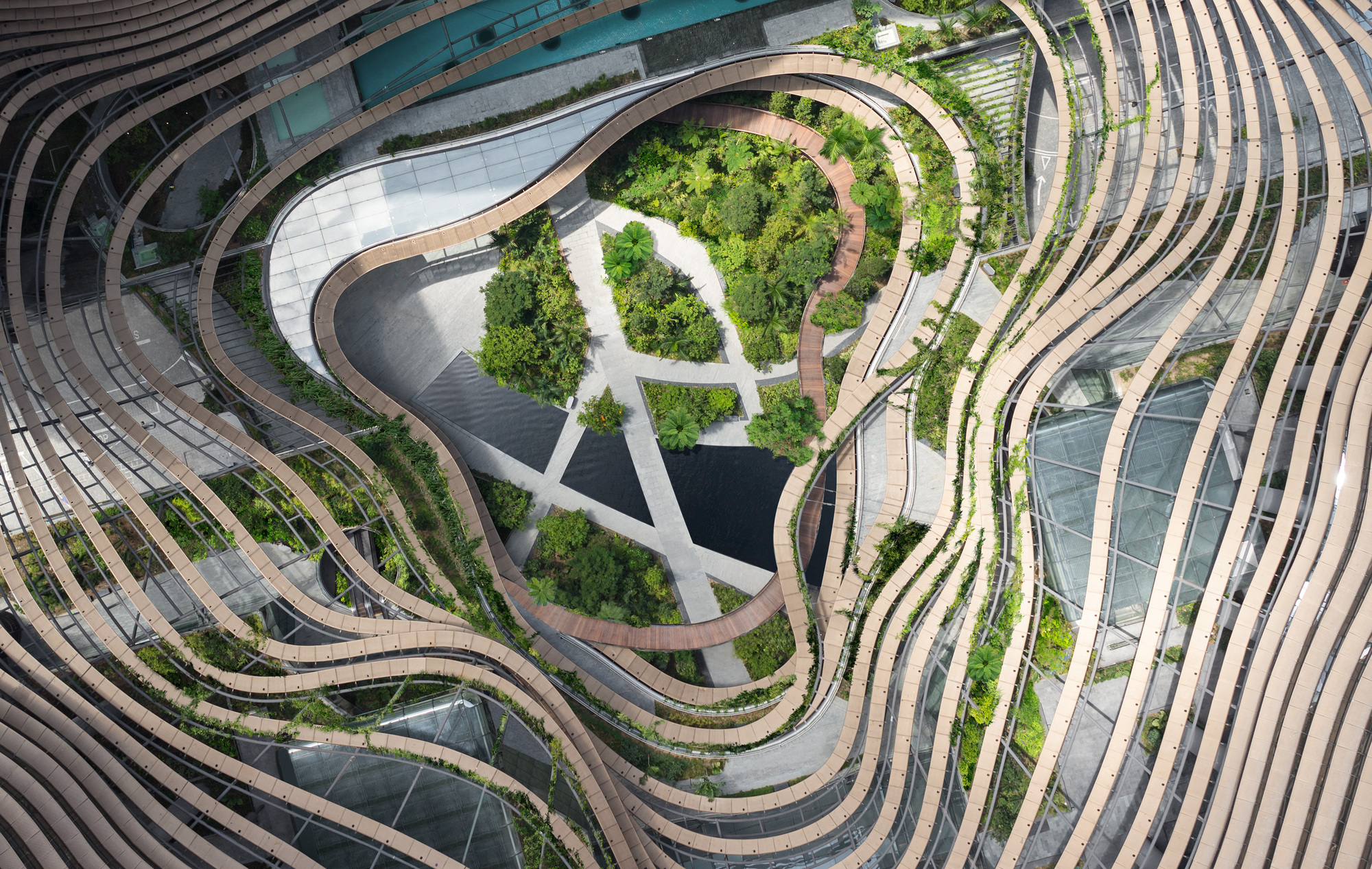 - The Green Heart tọa lạc tại Marina One, là điểm check-in cho những ai yêu thích không gian xanh và kiến trúc độc đáo. Thiết kế được lấy cảm hứng từ những bậc thang có hình dạng lượn sóng, được bao phủ bởi hơn 350 loại cây và thực vật khác nhau. Bước vào đây giống như bước vào một thế giới khác, hoàn toàn tách biệt khỏi sự ồn ào và náo nhiệt của thế giới bên ngoài. Bốn tầng được trồng nhiều loại cây nhiệt đới, giống như một khu rừng mưa nhiệt đới thu nhỏ. Ở trong một không gian như vậy, người ta không chỉ cảm nhận được sự tiến bộ của công nghệ kiến trúc mà còn trải nghiệm được cảm giác cân bằng trong sự chung sống hài hòa với thiên nhiên.