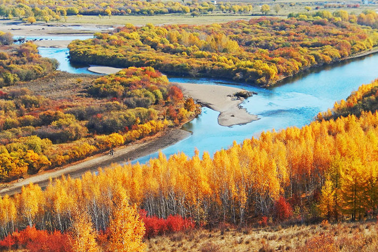 - Căn Hà (Genhe) – nổi tiếng với rừng Taiga (lá kim) lớn nhất Trung Quốc; mùa thu cây bạch dương, thông vàng rực xen kẽ xanh ngát, rất thích hợp ngắm lá đổi màu.